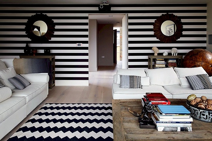 Motif garis horizontal ini bisa digunakan pada dinding. Untuk warna garisnya, pilihlah warna aman seperti hitam dan putih. Tapi jika anda berani bereksperimen menggunakan warna lain, mengapa tidak?